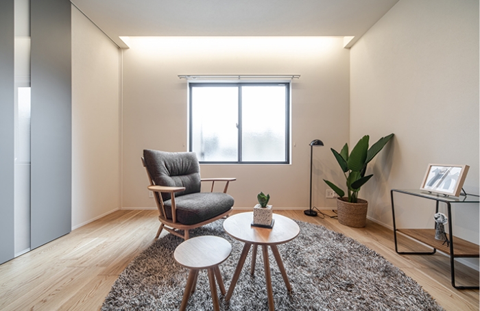 LDKにつながる和室をフローリングの洋室に、壁面収納を追加して扉や床などの部材は一新、キッチン、バス、トイレ設備はハイグレードに交換、サッシは断熱性や防音性を高める二重窓にしました。